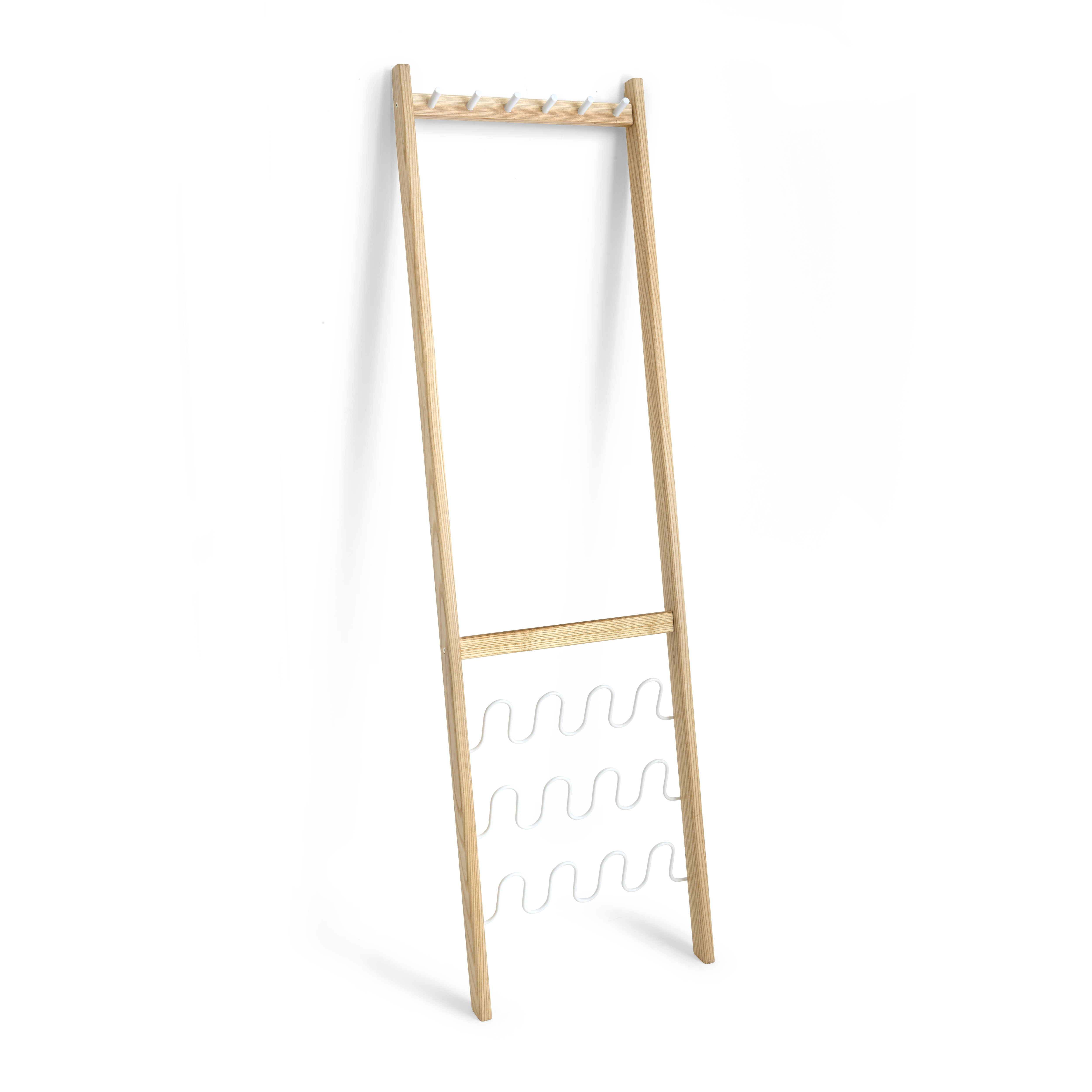 Multi-functional leaning coat rack design features a set of hooks for coats and a section for storing six sets of shoes. Made with ash and powder-coated steel.